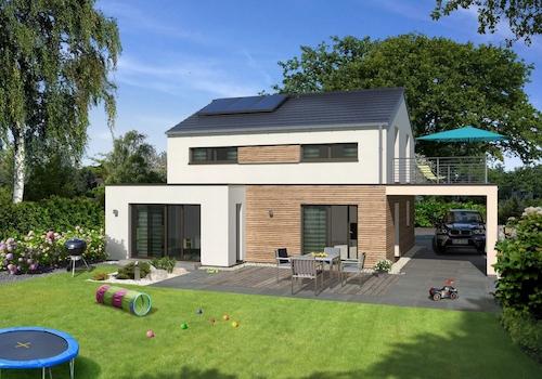 Das Einfamilienhaus ist modern und elegant in der Architektur. Auf dem Dach des Carports entsteht ein großzügiger Balkon für die Räume im Obergeschoss. Durch den erhöhten Kniestock ergibt sich für die Räume im ...