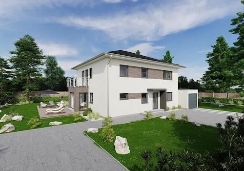 Der repräsentative Doppelhausentwurf mit Satteldach ist mit einem Zwerchgiebel mit Flachdach und einem Erker mit Flachdach geplant und ist deshalb sehr besonders. Die Küche liegt an der Frontseite des Hauses, bietet ...