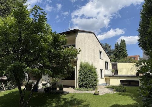 Einfamilienhaus am Hang, ein Stockwerk, mit Keller und ausgebautem Dachgeschoss, 140 Quadratmeter Wohnfläche, mit unterirdischer Garage und Abstellraum, sowie Schuppen. Baujahr ab 1987, Dachgaube ergänzt im Jahr 2005. ...