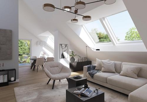 -Wohnfläche gesamt 60,00qm -Balkon 3,75qm (in Wfl. enthalten) -2,5 Zimmer -Garderobe -Tageslichtbad mit bodengleicher Dusche -großer Wohn-/Essbereich mit Küchenzeile -große Dachflächenfenster mit Aufkeilrahmen -Balkon