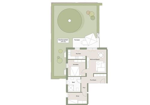 Die Wohnung Nr. 1 im Erdgeschoss rechts verfügt über eine Wohnfläche von 62 m² und besteht aus einem Flur, einem Schlafzimmer, einem Badezimmer mit WC, einem Kinderzimmer, einer Küche und einem Wohnzimmer. Außerdem ...
