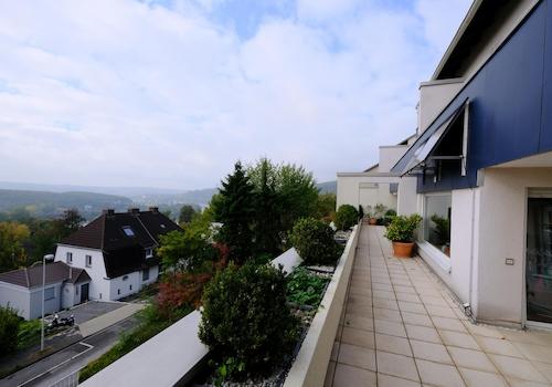 Das Herzstück der Wohnung ist der große lichtdurchflutete Wohn- und Essraum mit offener Küche. Von hier genießt man einen traumhaften Ausblick über das Ruhrtal und hat Zugang zur der riesigen Süd-Terrasse mit ca. 50qm, ...