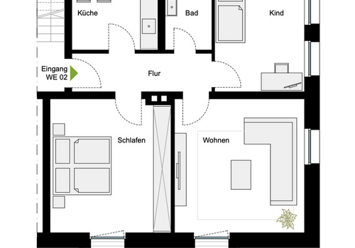 Die Wohnung mit der Nummer 6 befindet sich im zweiten Stock auf der linken Seite und hat eine Wohnfläche von 61 m². Sie besteht aus einem Flur, einem Schlafzimmer, einem Badezimmer mit WC, einer Küche und einem ...