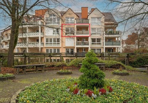 Der Wohnkomplex in der Nähe des Alten Kurparks ist terrassenförmig angelegt und verfügt über externe Treppenzugänge zu den einzelnen Wohneinheiten. Die zum Verkauf stehende Einheit befindet sich im obersten Geschoss. ...
