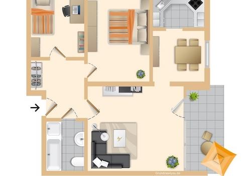 Die Wohnung im Erdgeschoss mit der Nummer 8 bietet eine Wohnfläche von 85 Quadratmetern. Sie verfügt über einen Flur, ein Gäste-WC, ein Schlafzimmer, ein Badezimmer mit WC, ein Kinderzimmer, eine Küche, ein Wohnzimmer ...