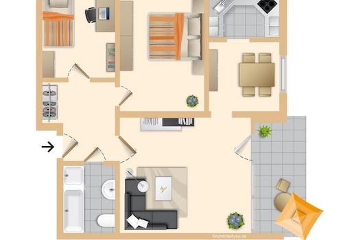 Die Wohnung Nummer 4 im dritten Stock links in der Mitte (mit Aufzug) verfügt über eine Wohnfläche von 74 Quadratmetern. Sie umfasst einen Flur, ein Schlafzimmer, ein Badezimmer mit WC, ein Kinderzimmer, einen ...