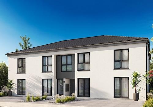 Das zweigeschossige Mehrfamilienhaus mit zwei Wohnungen überzeugt mit einer klassisch eleganten Architektur mit Walmdach und zwei behaglichen Terrassen. Der Hausentwurf kann mit Stahlbalkonen an der Gartenseite ...