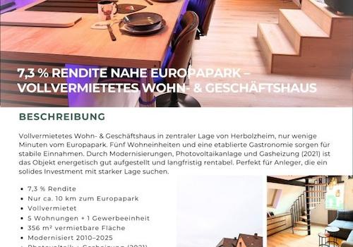 Dieses gepflegte Wohn- und Geschäftshaus befindet sich in zentraler Lage von Herbolzheim und stellt eine äußerst attraktive Kapitalanlage im nördlichen Breisgau dar. Die Immobilie umfasst fünf vermietete Wohneinheiten ...