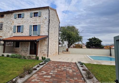 An einer ruhigen Lage in Kastelir, nur 7 km vom Meer und 10 km von Porec entfernt, befindet sich dieses charmante, komplett renovierte Doppelsteinhaus, das traditionellen istrischen Stil mit modernem Komfort verbindet. ...