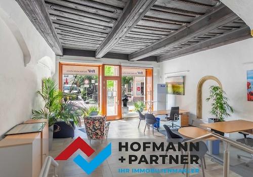 Der ca. 42 m² große Verkaufsraum besitzt eine voll verglaste Schaufensterfront mit Ladeneingangstür zur Straße. Die gut erhaltene Holzbalkendecke und die historischen Sandsteinelemente verleihen dem Raum ein besonders ...