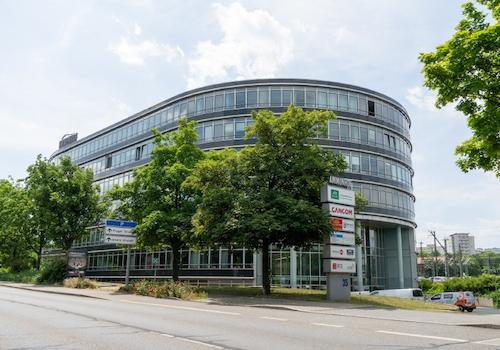Das ovale Gebäude mit seiner Alu-/Glas-Fassade und seinem großzügig innenliegenden Atrium setzt städtebauliche Akzente. Mehrere Personenaufzüge befinden sich im Haus. Hohlraum- und Doppelbodensysteme sorgen für ...