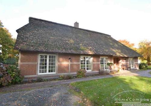 Dieses tolle Reetdach-Haus liegt sehr idyllisch auf dem Grundstück einer Baumschule im Ammerland. Über einen kleinen Flur gelangt man in den großen gemütlichen Wohnbereich mit einem Kamin und einer Sitzecke. Feuerholz ...