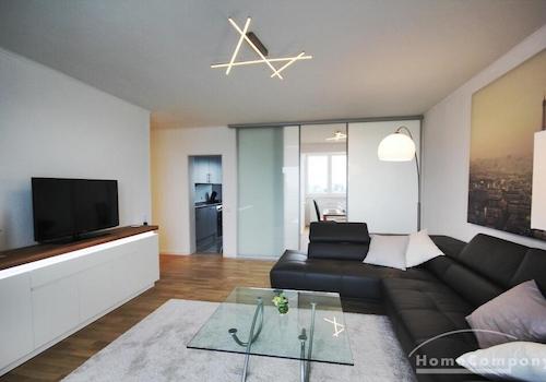 Vollmöblierte und gehoben ausgestattet Wohnung Wohnzimmer Großes Wohnzimmer mit gemütlichem Kamin und dimmbarem Licht, Sofa von Ligne Roset, Gira Audiotainment, Samsung-TV Schlafzimmer komfortables, exklusives Aurea ...