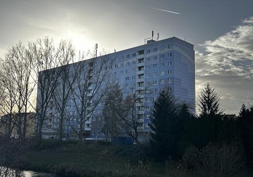 Die Wohnung befindet sich in einem 11-geschossigen Hochhaus an der Weißen Elster. Vor dem Objekt befinden sich ausreichend Stellplätze die mit einer Parkkarte nutzbar sind.
