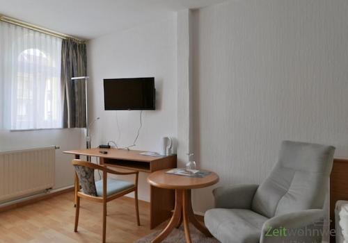 ### Please note the availability date! Bitte das Verfügbarkeitsdatum beachten! ### möbliertes Apartment in Meißen; kleiner Wohnraum mit Bett, Sessel, Esstisch, Kleiderschrank, Schreibtisch und TV, kleiner Flurbereich; ...