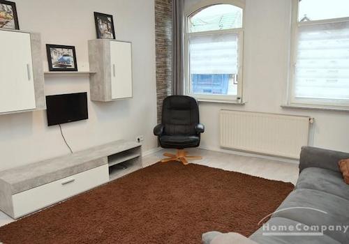 Mehrfamilienhaus in ruhiger Straße. Modern möblierte Wohnung, Kiefernholzmöbel. Wohnzimmer mit Couch, Tisch, Kommode, Vitrinenschrank, Korbstuhl, Schreibtisch mit Stuhl, DVBT-TV. Schlafzimmer mit Doppelbett, Kommode, ...