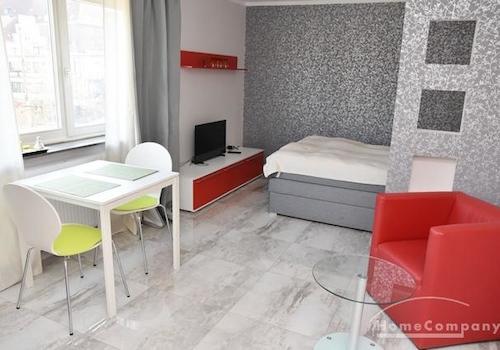Modernes Apartment im 2.OG mit Aufzug in zentraler Lage, Calenberger Neustadt, 5 Gehminuten bis Innenstadt! Nur an Nichtraucher. Wohn-/Schlafzimmer mit Bett 1,20x2 m, roter Ledersessel, Tisch mit 2 Stühlen, ...