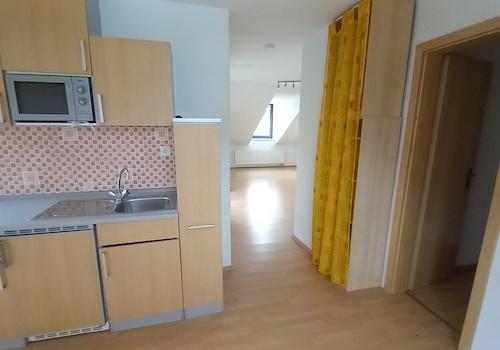 DG - Wohnung 60 qm, schräge Wände und Erkerfenster, 1 Wohn - Küche mit Essbereich EBK ( Küchenblock ) - Laminat 1 Abstellraum ( Speise ) 1 Bad mit Fenster, Wanne, - Fliesen 1 Schlafzimmer - Laminat 1 Wohnzimmer - ...