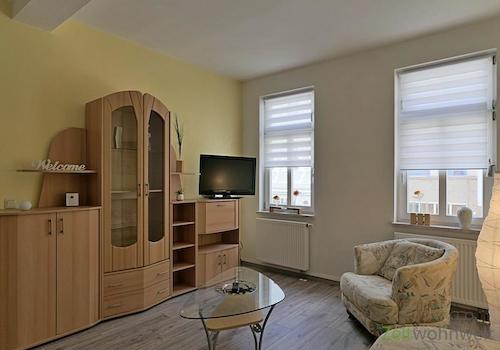 ### Please note the availability date! Bitte das Verfügbarkeitsdatum beachten! ### möblierte 2-Zimmer-Wohnung mit WLAN in der schönen Meininger Fußgängerzone; neu renoviert und neu möbliert; Wohnzimmer mit Sessel, ...