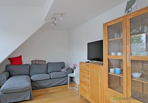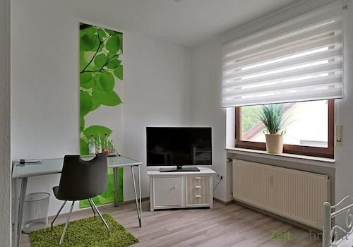 ### Please note the availability date! Bitte das Verfügbarkeitsdatum beachten! ### möbliertes Dachgeschoss-Apartment mit breiter Fensterfront; WLAN inklusive; großer Wohnraum mit breitem Bett, Kleiderschrank, Wand-TV, ...