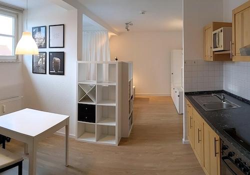 Stilvolle, renovierte 1-Zimmer-Wohnung mit maßgeschneidertem Raumkonzept, WLAN und Strom inklusive Raumkonzept: Diese Wohnung wurde von einem Innenarchitekten gestaltet und bietet ein herausragendes Raumkonzept. Die ...