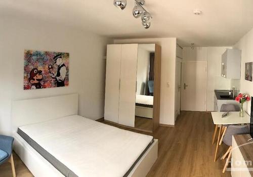 1-Zimmer-Apartment in der Neustadt von Köln! Absolut hell durch die große Fensterfront, ruhig gelegen, mit Aufzug, im 2. Obergeschoss. Ein kombinierter Wohn- und Schlafraum mit einem 160er Bett, 43 Zoll-Flachbildfernseh ...