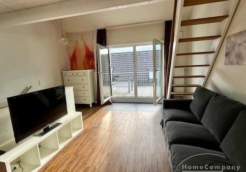 Helle 1,5- Zimmerwohnung auf 2 Ebenen mit großer Dachterrasse in beliebter Hofheimer Wohnlage AusstattungWohnen: Unten befindet sich der Wohnbereich mit Sofa.Küche: helle und offene Küche wird in den Wohn- und ...