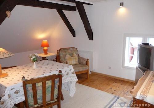 2 Zi.Whg., möbliert, 1. und 2. OG (DG, 50 qm nach Din, Grundfläche größer, mit Schrägen). Wohnzi. mit offener Küche im 1. OG. Schlafzimmer u. Bad im 2. OG. Miete 650,- € zuzügl. Strom nach Verbrauch (Nachtspeicherhzg., ...