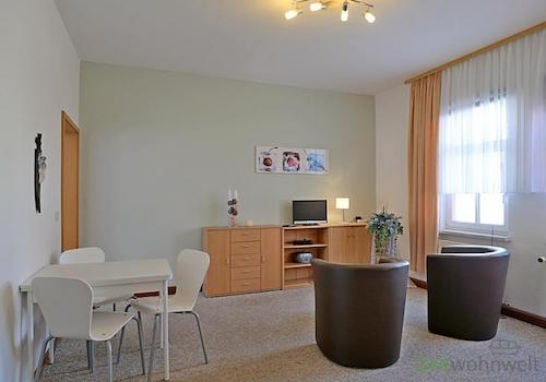 ### Please note the availability date! Bitte das Verfügbarkeitsdatum beachten! ### möblierte Wohnung im 1.Obergeschoss, nahe zur Jenaer Innenstadt; helles Wohnzimmer mit Couch, Sessel, Esstisch, Sideboard und TV (zum ...