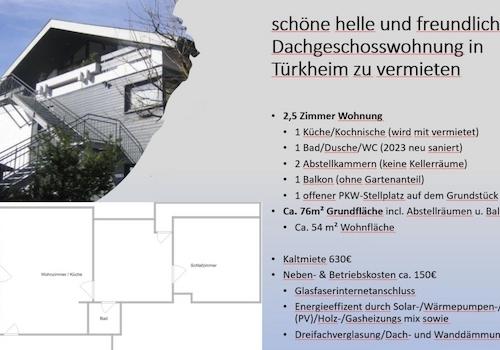 Charmante, lichtdurchflutete Dachgeschoss Wohnung zum 01.05.2026 zu vermieten, eventuell auch früher nach Absprache möglich. Gehobene Innenausstattung in der zweiten Etage. Vermieter bewohnt das EG und 1. OG im Haus. ...