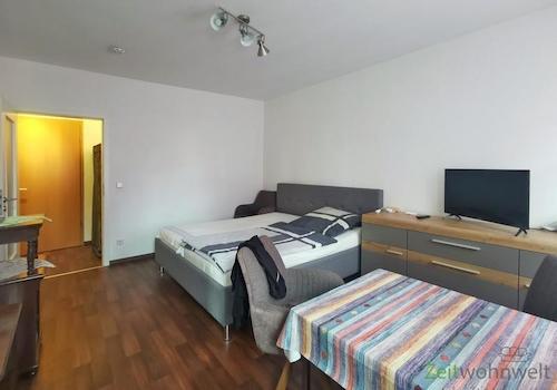 ### Please note the availability date! Bitte das Verfügbarkeitsdatum beachten! ### möbliertes Apartment in DD-Mickten; Wohnraum mit Bett, Kleiderschrank, Sessel, TV und Schreibtisch; Küchennische mit Esstisch; Bad mit ...