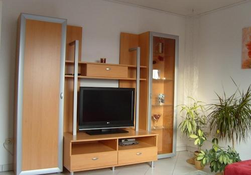 Modern eingerichtete Wohnung mit allen Möbeln, Hotelkomfort mit Einbauküche (Spülmaschine, Herd, Kühlschrank, Schränken), Wohnzimmer mit Couch, Tisch, Einbauschränke, Fernseher, Lampen, Bildern, Teppichen, Schlafzimmer ...