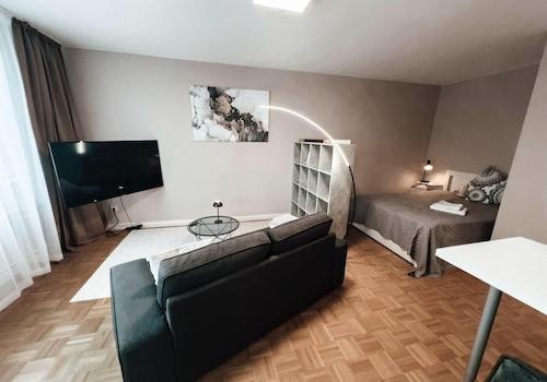 2 Zimmer Apartment in Offenbach Mühheim, in Neubaukomplex Wohnen: helles Wohnzimmer mit Sofa, TV und Zugang zur Terrasse Küche: Die Küche ist von Segmüller in gutem Zustand. Die Geräte sind von Bauknecht, Zanussi, ...