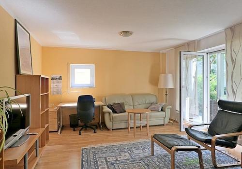 ### Please note the availability date! Bitte das Verfügbarkeitsdatum beachten! ### modern möbliertes Apartment im Souterrain mit ruhigem Schlafzimmer zur Gebäuderückseite; WLAN inklusive; großes helles Wohnzimmer mit ...