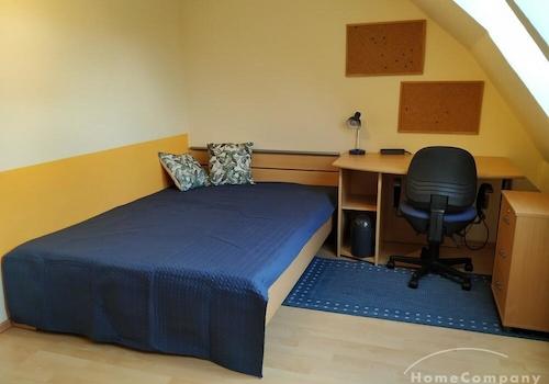 Das Zimmer ist eines von drei Zimmern in einer 89qm² großen Drei-Zimmer-Dachgeschosswohnung. Die Wohnung in einem Doppelhaus mit separatem Eingang verfügt über ein Vollbad, eine Einbauküche mit Kaffeemaschine, ...
