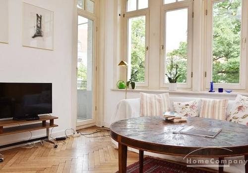 Schick, zentral und ruhig! Schöne 2-Zimmer Wohnung mit modernen Möbeln im 2. OG einer wunderschönen Villa im beliebten Zooviertel von Hannover. Wohnzimmer mit Couch, Couchtisch, 2 Sesseln, Sideboard mit Sat-TV ...