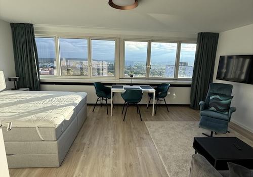 Vollmöbliertes 1-Zimmer Apartment mit Ausblick im 14. Stock des SI-Centrum in Stuttgart-Möhringen. Komplett Saniert und neu vollmöbliert in 2023. In Mietpreis inbegriffen: Möblierung/Ausstattung, Wasser, Heizung, ...