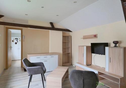 ### Please note the availability date! Bitte das Verfügbarkeitsdatum beachten! ### kleine möblierte Wohnung in zentrumsnaher Wohnlage; helles Wohnzimmer mit Sofa, Schrankwand und TV, kleine Küche mit abklappbarem ...