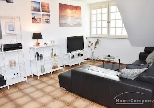 Möblierte 2-Zimmer-Einliegerwohnung im Dachgeschoss eines ruhigen Einfamilienhauses in einer ruhigen Privatstraße unweit des Tiergartens. Wohn-/Essbereich mit Sofa, Fernseh-Sessel, Sessel, Couchtisch, Regale, Esstisch ...