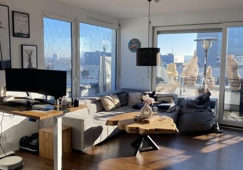 Lichtdurchflutete Penthousewohnung mit 2,5 Zimmer, bodentiefen Fenstern, Fußbodenheizung, 3 seitiger Dachterasse, teilmöbliert (nach Absprache) für bis zu 24 Monate zu vermieten. Beste Lage im Möhringer Seepark. Ost / ...