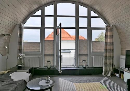 ### Please note the availability date! Bitte das Verfügbarkeitsdatum beachten! ### exklusives Apartment mit Klimaanlage in bevorzugter Wohnlage "Am Hopfenberg"; großes Wohnzimmer mit großem Rundbogenfenster; Eckcouch, ...