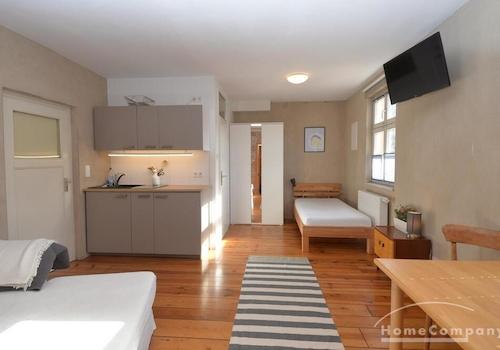 AG134536 Top nagelneu sanierte Altbauwohnung im Vorderhaus. Die Wohnung verfügt über ein Wohn-/Schlafzimmer mit einen Bett. Die Küche ist offen zum Wohnraum. Die Wohnung ist komplett ausgestattet mit TV - Geräte. Der S ...
