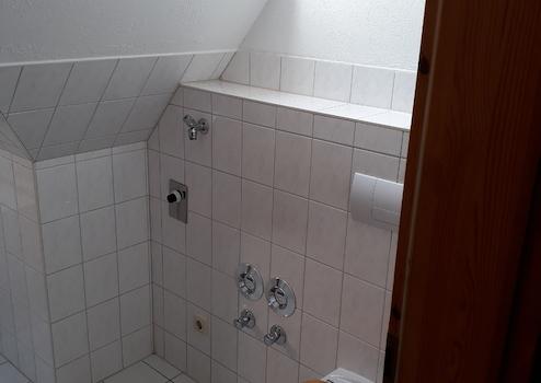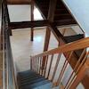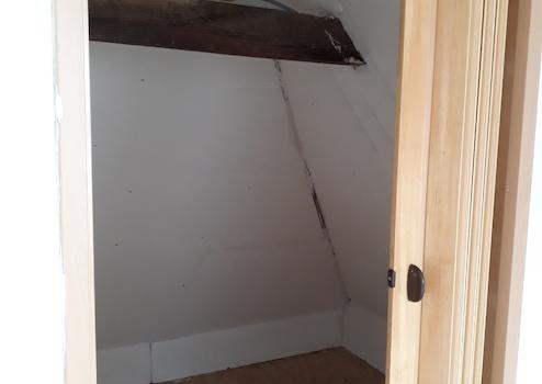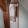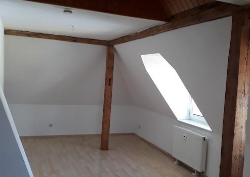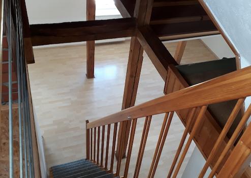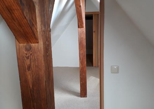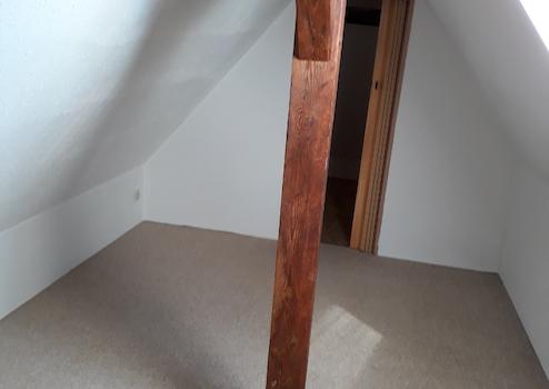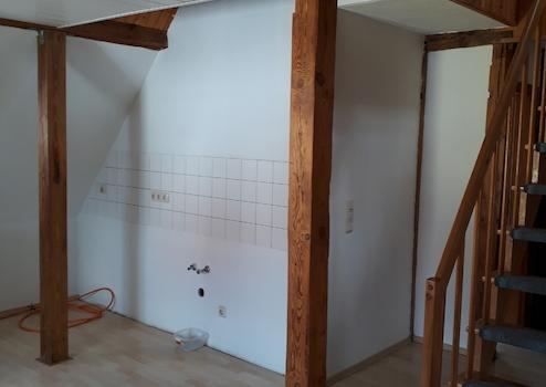 Die Wohnung besteht aus Flur, großzügiger Wohnküche, Schlafzimmer und Bad im unteren Geschoss, im oberen Geschoss befinden sich ein weiterer Flur, ein weiteres kleines Zimmer und eine Abstellkammer, die von den Vormietern als begehbarer Schrank genutzt wurde. In der gesamten Wohnung gibt es sichtbare Dachbalken.