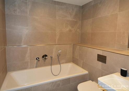 Modern gefliestes Badezimmer mit Dusche und Wanne. Wohnung verfügt überall über Parkett und eine Fußbodenheizung.