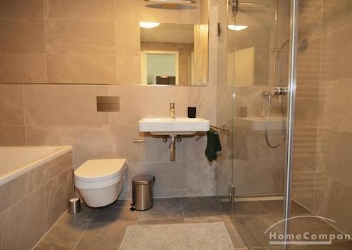 Modern gefliestes Badezimmer mit Dusche und Wanne. Wohnung verfügt überall über Parkett und eine Fußbodenheizung.