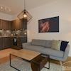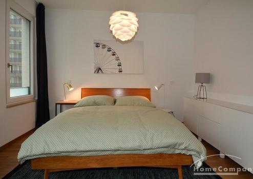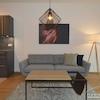 Neubau, hoher Standard. Modernes, aber angenehmes Interieur mit Charakter. Wohnzimmer mit offener Küche und Balkon, ruhiges Schlafzimmer mit neuem Boxspring-Bett. Das moderne Bad hat eine Dusche. Zur Ausstattung gehören Spülmaschine, Waschmaschine, Smart-TV und vieles mehr. Die Fenster sind durch elektrische Rollos voll abzudunkeln.