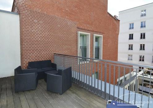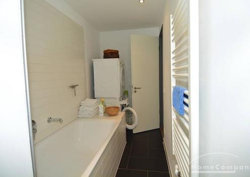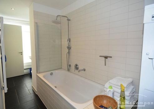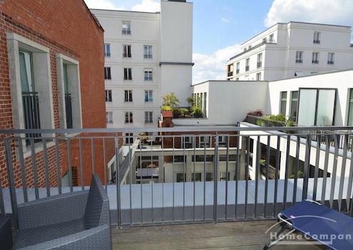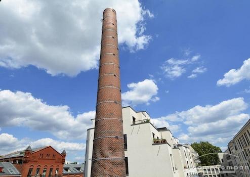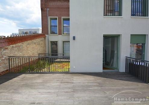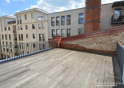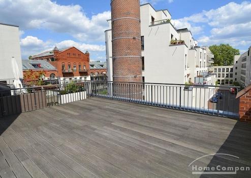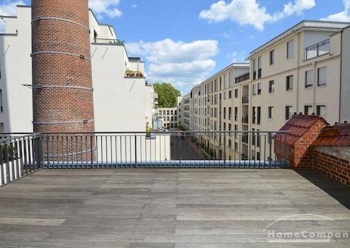 Exklusive Penthouse-Wohnung mit zwei Dachterrassen im sanierten Kesselhaus der Tivoli-Brauerei, im Zentrum Kreuzberg, direkt am Viktoriapark. Hochwertig möbliert und komplett ausgestattet, 2,5 Zimmer auf insgesamt ca. 85 Quadratmetern. Schlafzimmer mit Terrasse und en suite Bad (Badewanne). Gäste-WC vorhanden. An das Wohnzimmer schließt das Arbeitszimmer und die offene, aber räumlich separierte Einbauküche an. Von der Küche gelangt man über eine Wendeltreppe zur zweiten Terrasse.