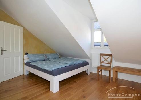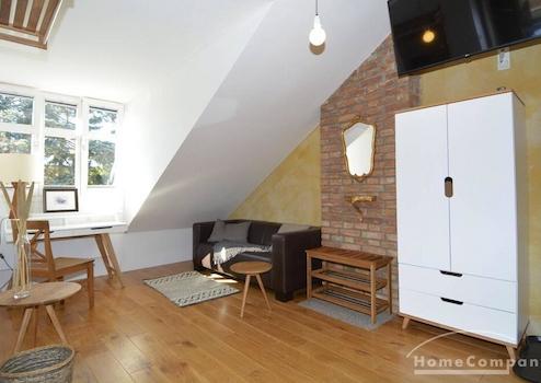 Neu sanierte Altbauwohnung im Dachgeschoss. Die Wohnung verfügt über ein Wohn-/Schlafzimmer mit einen Bett. Die Küche ist offen zum Wohnraum. Die Wohnung ist komplett ausgestattet mit TV und Geräten. Der S-Bahnhof Babelsberg (S1,S7) befindet sich in 10 Minuten Fußweg. Die Wohnung liegt direkt am Park Babelsberg und in der Nähe des Stadtbads Babelsberg.