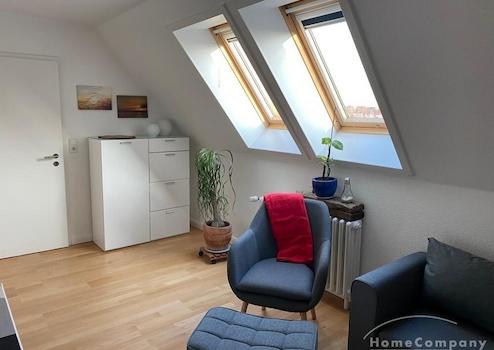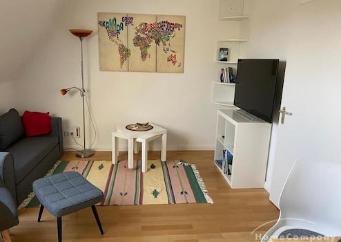Die möblierte, helle Wohnung mit separatem Eingang verfügt über zwei Zimmer, eine kleine und voll ausgestattete Einbauküche sowie ein Tageslichtbad mit Dusche. Fernseher und WiFi sind vorhanden. Sie ist im 1. OG und deshalb angenehm hell. Die Wohnfläche beträgt ca. 41 Quadratmeter.