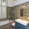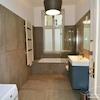 Gefliestes Tageslichtbad mit Badewanne und Waschmaschine. Internet ist ebenfalls vorhanden.